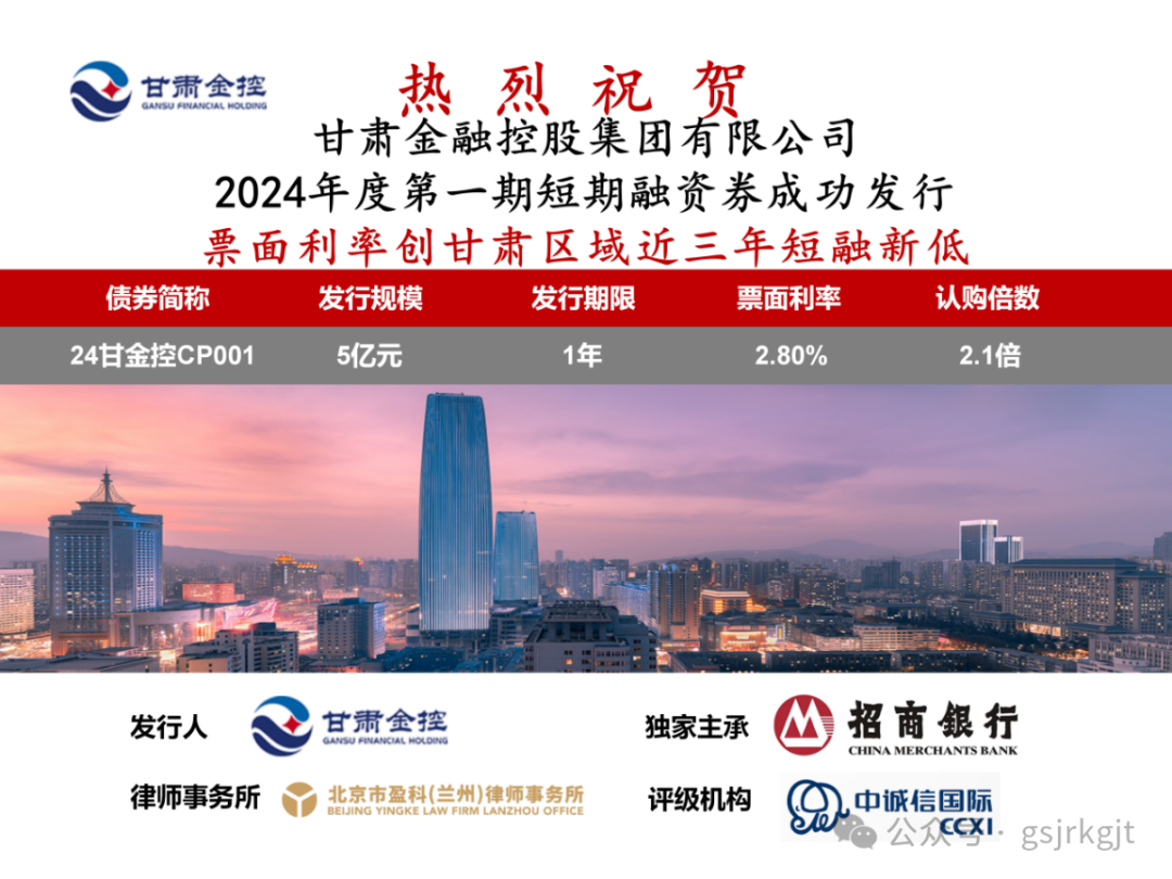 2024年2月6日,甘肅金控集團成功發(fā)行2024年度第一期短期融資券,發(fā)行規(guī)模5億元,債券期限一年,票面利率2.80%,債券票面利率創(chuàng)甘肅區(qū)域近三年同品種債券利率新低。