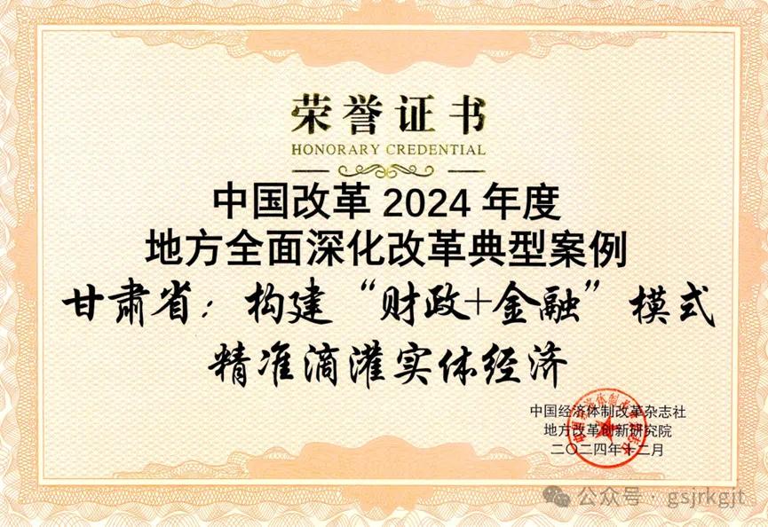 新甘肅客戶端蘭州訊(新甘肅·甘肅日?qǐng)?bào)記者曹立萍)日前,甘肅省構(gòu)建“財(cái)政+金融”模式精準(zhǔn)滴灌實(shí)體經(jīng)濟(jì)案例入選“中國(guó)改革2024年度案例”。這是此次我省入選15個(gè)改革案例中,唯一一個(gè)涉及財(cái)政金融領(lǐng)域的改革案例。