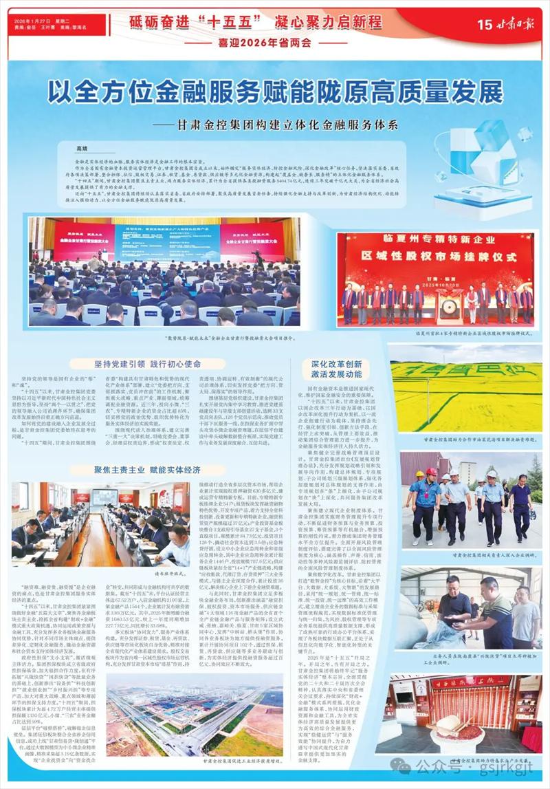 2026年是“十五五”開(kāi)局之年。開(kāi)局之年,當(dāng)有開(kāi)局之力。甘肅金控集團(tuán)將始終牢記“服務(wù)實(shí)體經(jīng)濟(jì)”根本宗旨,全面貫徹黨的二十大和二十屆歷次全會(huì)精神,認(rèn)真落實(shí)中央和省委相關(guān)會(huì)議要求,持續(xù)深化“財(cái)政+金融”模式系列措施,優(yōu)化金融服務(wù)體系,協(xié)同運(yùn)用財(cái)政資源和金融工具,為全省實(shí)體經(jīng)濟(jì)高質(zhì)量發(fā)展提供更為高效的綜合金融服務(wù),實(shí)現(xiàn)“穩(wěn)健運(yùn)營(yíng)”與“服務(wù)效能”協(xié)同提升,為奮力譜寫(xiě)中國(guó)式現(xiàn)代化甘肅篇章提供更加堅(jiān)實(shí)的金融支撐。(高婧)