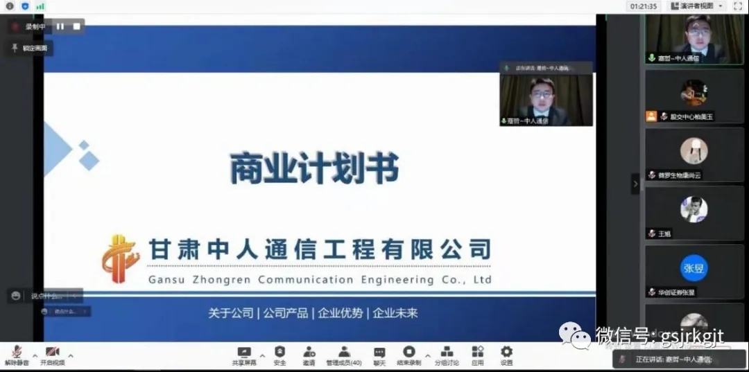 近日,甘肅股權(quán)交易中心首次采取云路演的方式舉辦“微路演(專精特新專場(chǎng))”,對(duì)3家“專精特新”企業(yè)進(jìn)行項(xiàng)目融資推介,省內(nèi)銀行、證券公司、投資機(jī)構(gòu)等相關(guān)代表,共計(jì)40余人參加本次云路演項(xiàng)目融資推介會(huì)。