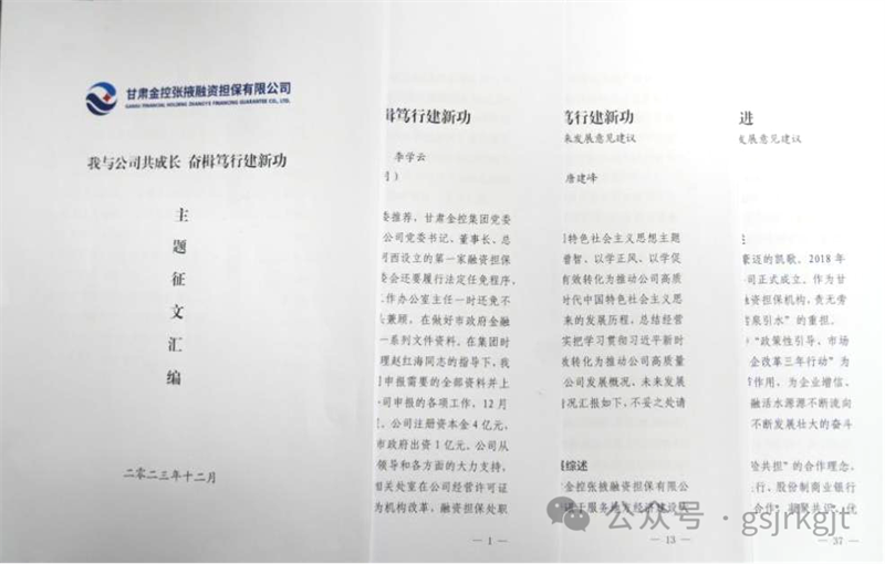 一、開展一次主題征文活動為切實將主題教育激發(fā)的動力有效轉(zhuǎn)化為推動高質(zhì)量發(fā)展的實績,金控張掖擔(dān)保組織全員開展了“我與公司共成長,奮楫篤行建新功”主題征文活動。征文通知發(fā)出后,公司領(lǐng)導(dǎo)班子帶頭,積極踴躍投稿,全員結(jié)合五年來的工作實際談感悟、說想法、講實績、找不足、獻良策。征集到的13篇稿件既有高度又有深度,達到了共話成就、共謀發(fā)展、共同進步的預(yù)期效果。