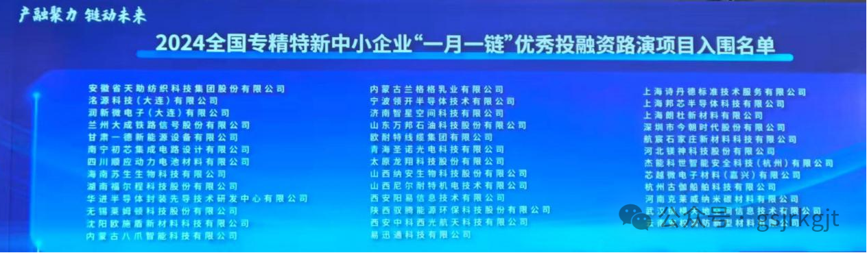 近日,“一月一鏈” 中小企業(yè)融資促進全國行上海站活動開啟。全國 6 家專精特新中小企業(yè)在活動中進行了項目路演推介,其中甘肅股權(quán)交易中心“專精特新專板”掛牌企業(yè)蘭州大成鐵路信號股份有限公司和甘肅一德新能源設(shè)備有限公司成功入圍 2024 年全國專精特新中小企業(yè) “一月一鏈” 優(yōu)秀投融資路演項目。