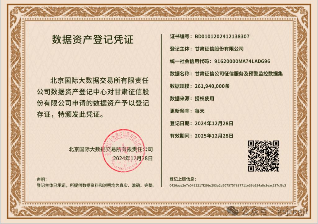 近日,甘肅征信成功完成首單數(shù)據(jù)資產(chǎn)入表工作?!案拭C征信公司征信服務(wù)及預(yù)警監(jiān)控?cái)?shù)據(jù)集” 數(shù)據(jù)產(chǎn)品順利通過(guò)北京國(guó)際大數(shù)據(jù)交易所審核公示,取得數(shù)據(jù)資產(chǎn)登記憑證(證書(shū)編號(hào):BD0101202412138307),成為甘肅省省內(nèi)首例以征信數(shù)據(jù)實(shí)現(xiàn)數(shù)據(jù)資產(chǎn)入表的省屬國(guó)有企業(yè)。