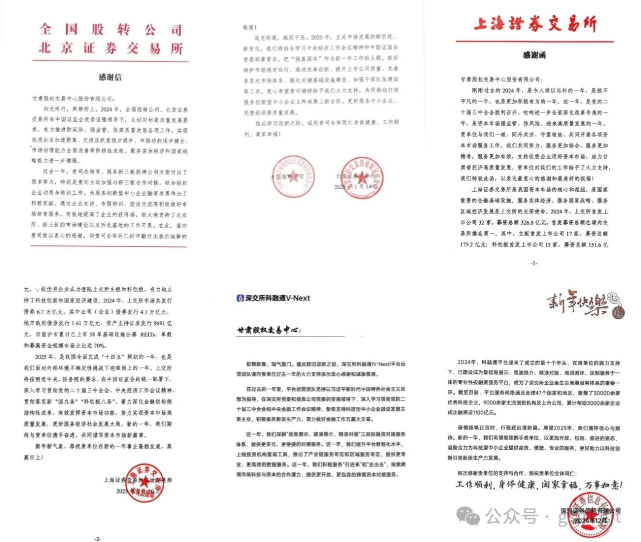 近日,甘肅股權(quán)交易中心收到北京證券交易所和全國股轉(zhuǎn)公司、上海證券交易所、深圳證券信息有限公司感謝信,對甘肅股權(quán)交易中心過去一年給予的支持表示感謝,同時(shí)希望未來進(jìn)一步加強(qiáng)合作交流,凝聚合力服務(wù)實(shí)體經(jīng)濟(jì)高質(zhì)量發(fā)展。
